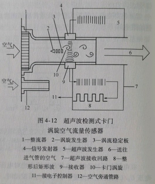 反光镜检测式是利用涡流发生器产生涡旋时,其两侧空气压力会发生变化的这一特点用导压孔将空气作用于涡流发生器的压力振动引向用薄金属制成的反光镜,使反光镜产生振动。反光镜将发光管投射的光反射给光敏管反光镜振动时,光敏管产生与涡旋频率相对应的电信号。3)超声波检测式。超声波检测式空气流量传感器的原理如图4-12所示。