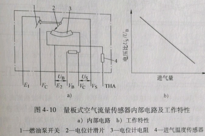1)基本组成与工作原理。量板式空气流量传感器由流量计和电位计两部分组成,如图4-9所示。