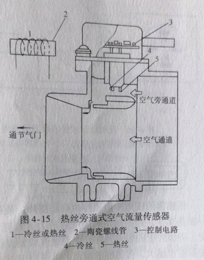 热丝旁通式空气流量传感器如图4-15所示。冷丝(空气温度补偿电阻)和热丝均绕螺线管上,安装在旁通的空气通道上,热丝的工作温度一般在200℃左右。采用旁通空气道检测进气流量,可以使主空气通道的进气阻力减小。