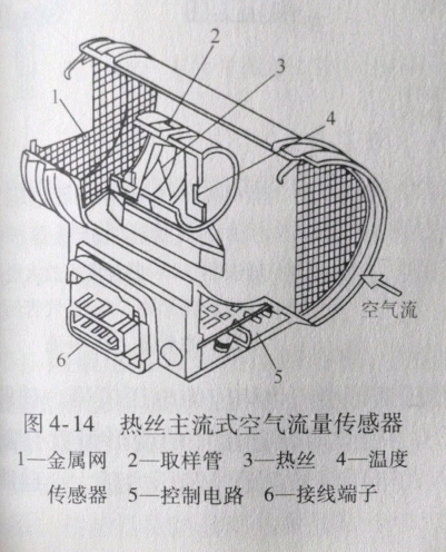 (4)热式空气流量传感器1)热式空气流量传感器的测量原理。在进气通道中放一个电热体,当空气通过时,空气将会带走热量而使电热体的温度下降,电热体的电阻下降,流过电热体的电流就会增加。