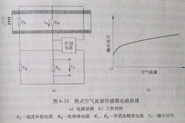 2)热式空气流量传感器的电路原理。热式空气流量传感器的电路原理如图4-13所示。