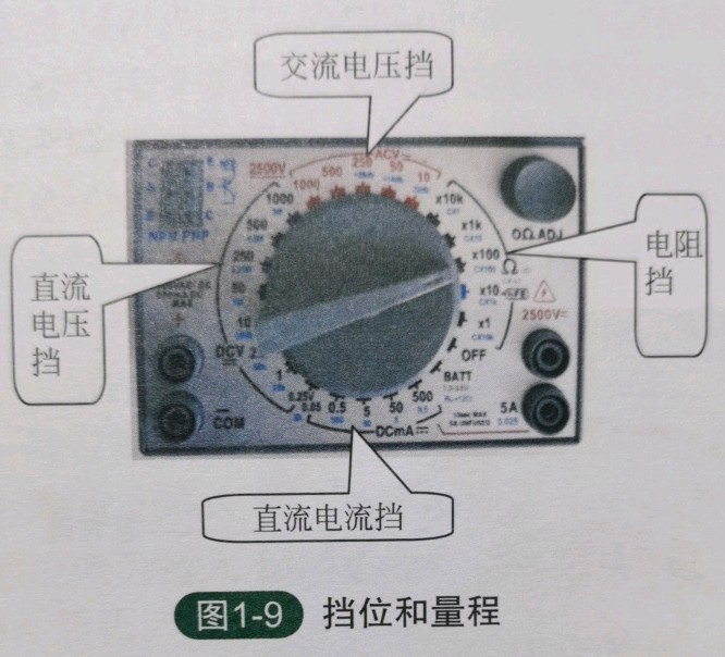 (3)选择挡位万用表的挡位和量程如图1-9所示。使用万用表进行测量时,首先应根据测量对象选择相应的挡位,然后根据测量对象的估计大小选择合适的量程。例如,测量220V市电,可选择交流电压“250V”挡。如果无法估计测量对象的大小,则应先选择该挡位的最大量程,然后逐步减小,直到能够准确读数。