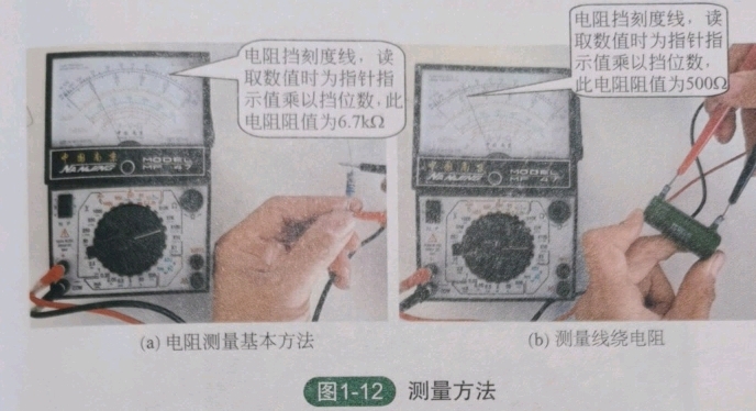 测量非在路的电阻时,将万用表两表笔(不分正、负)分别被测电阻的两端,指针指示出被测电阻的阻值,如图1-12所示。