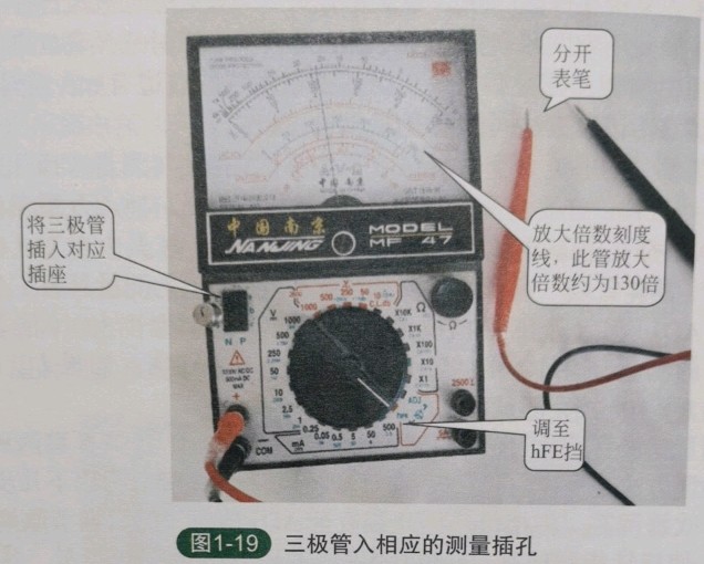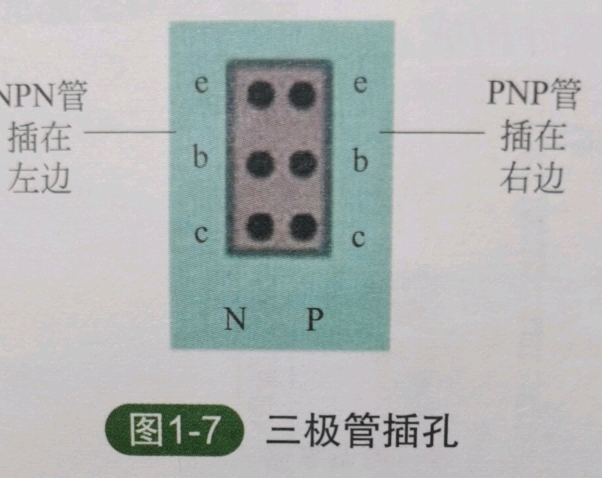 ·根据三极管的类型和引脚的极性将三极管插入相应的测量插孔PNP型三极管插入标有“P”字样的插孔,NP型三极管插入标有“N字样的插孔(图1-19)