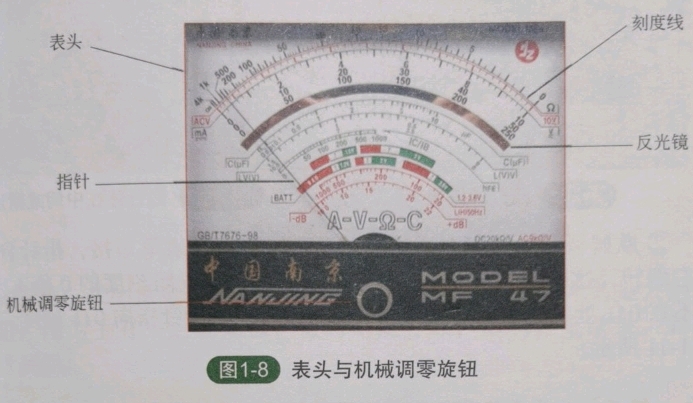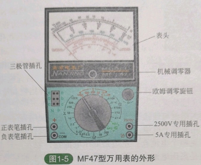 指针型万用表多使用MF47型万用表,其外形如图1-5所示。指针型万用表由表头、测量选择开关欧姆调零旋钮、表笔插孔、三极管插孔等部分构成。
