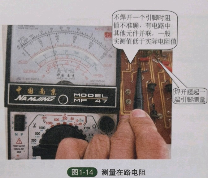 4测量电路板上的在路电阻时,应如图1-14所示将被测电阻的一端从电路板上焊开,然后再进行测量,否则由于电路和其他元器件的影响,测得的电阻值误差将很大。