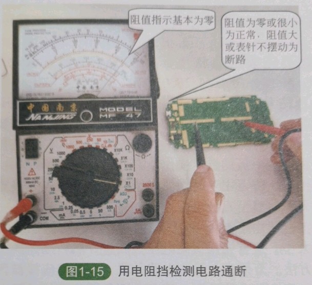 ⑤用电阻挡检测电路通断:用电阻挡检测电路通断时,可选用低阻挡直接测量被测电路,阻值基本为02为通,阻值很大或表针不摆动则为断路。如图1-15所示。