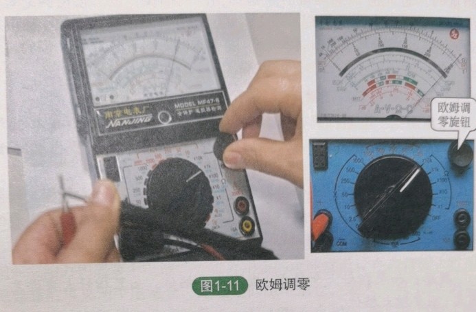 ②欧姆调零。选好合适的电阻挡后,将红黑表笔短接,指针自左向右偏转,这时指针应指向02(表盘的右侧,电阻刻度的0值)如果不在0Ω处,就要调整欧姆调零旋钮使万用表指针指向0刻度,如图1-11所示。