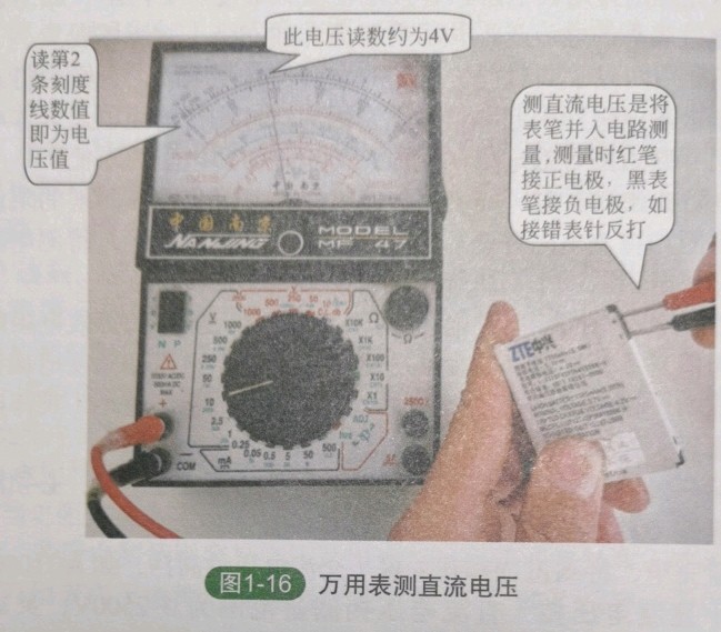 b.选择量程。由于电路中电源电压只有3.6V,所以选用10V挡。若不清楚电压大小,应首先用最高电压挡测量,然后逐渐换用低电压挡c.测量方法。万用表与被测电路并联,红表笔应接被测电路和电源正极相接处,黑表笔应接被测电路和电源负极相接处(图1-16)d.正确读数。