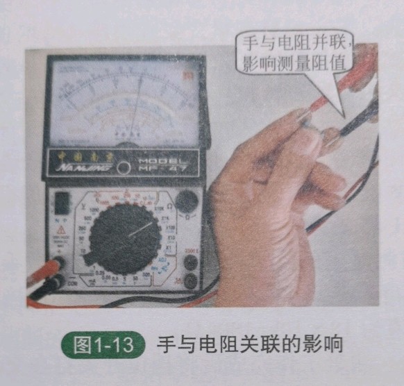 注意:在测量电阻时,手不能同时接触电阻两端,尤其是大阻值电阻,因为手有一定的阻值,会与电阻并联,影响测量结果。如图1-13所示。