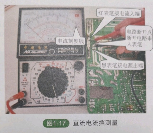 万用表测量直流电流量的具体操作步骤如图1-17所示。