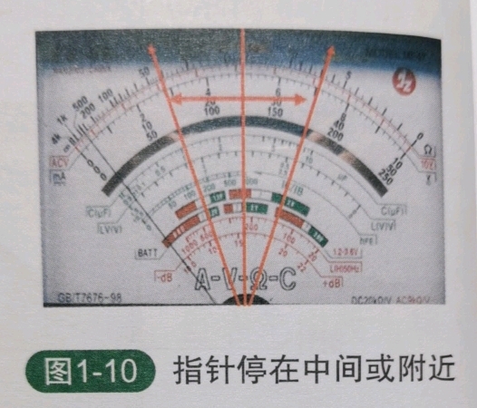 第二步:选择正确挡位。测量时,指针停在中间或附近,如图1-10所示。