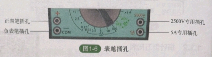 MF47型万用表共有4个表笔插孔。面板左下角有正、负表笔插孔,般习惯上将红表笔插入正表笔插孔,黑表笔插入负表笔插孔。面板右下角有2500V和5A专用插孔。当测量2500V交、直流电压时,红表笔应改为插入2500V插孔。当测量5A直流电流时,红表笔应改为插入5A插孔,如图1-6所示。