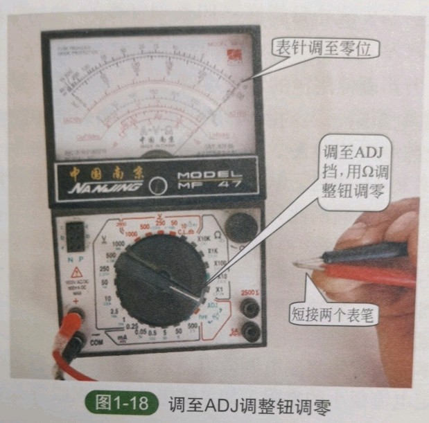 测量三极管的放大倍数:三极管类型有PNP型和NPN型两种,它们的检测方法是一样的。三极管的放大倍数测量主要分为以下几步·欧姆调零。将挡位选择开关拨至ADJ挡位,然后调节欧姆调零旋钮,使指针指到标有“hFE”刻度线的最大刻度“300”处,实际上指针此时也指在欧姆刻度线“0”刻度处(图1-18)