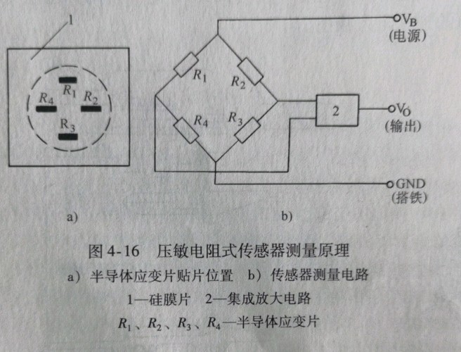 (1)进气管压力传感器的作用与类型1)作用。进气管压力传感器是将发动机进气管的压力转变为相应的电信号,进气压力是发动机电子控制系统计算基本喷油时间、确定基本点火提前角的重要参数,其作用如同空气流量传感器。因此,装备进气压力传感器的发动机电子控制系统,就不会有空气流量传感器。 2)类型。压力传感器有多种型式,根据其信号产生的原理可分为压电式、半导体压敏电阻式、电容式、差动变压器式及表面弹性波式等。由于半导体压敏电阻式进气管压力传感器具有线性度好、结构尺寸小、精度高、响应特性好等优点,因而已被汽车发动机电子控制系统广泛采用。 (2)半导体压敏电阻式进气管压力传感器1)半导体压敏电阻式传感器测量原理。半导体压敏电阻式传感器是利用半导体的压阻效应将压力转换为相应的电压信号,其原理如图4-16所示。 半导体应变片是一种受拉或受压变形时,其电阻值会相应改变的敏感元件。将应变片贴在硅膜片上,并连接成惠斯顿电桥,当硅膜片受力变形时,各应变片受拉或受压而发生电阻变化,致使电桥输出相应的电压。由于电桥输出的电压很低,需经集成放大电路放大后输出。 2)压敏电阻式进气管压力传感器的组成与原理。半导体压敏电阻式进气管压力传感器的组成如图4-17所示。