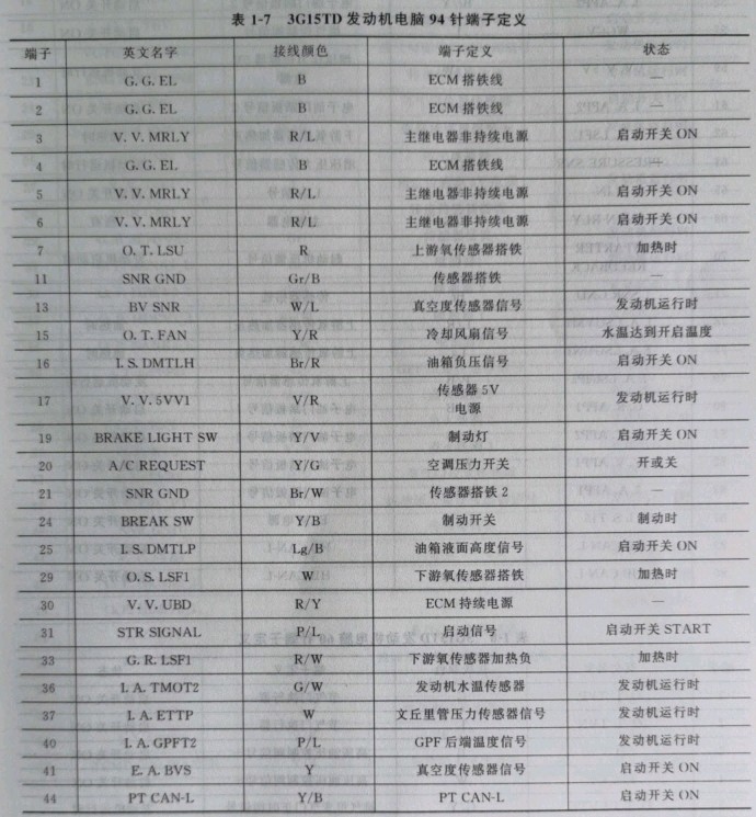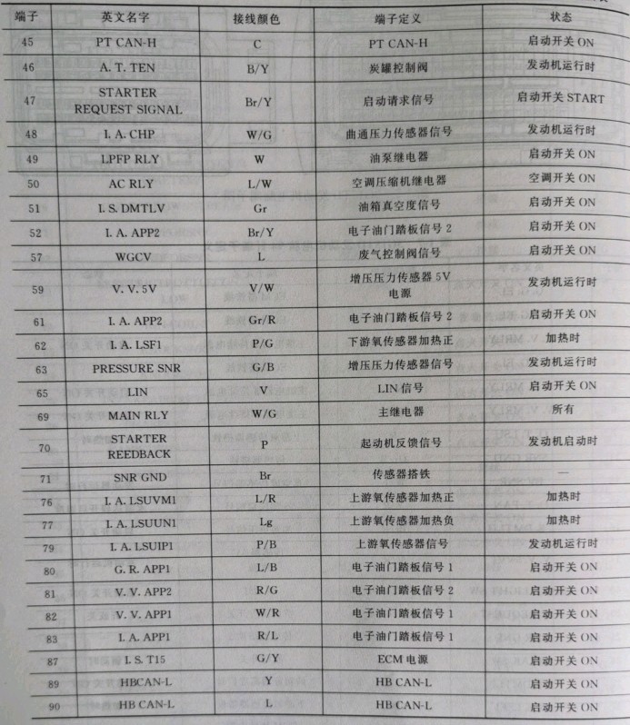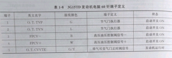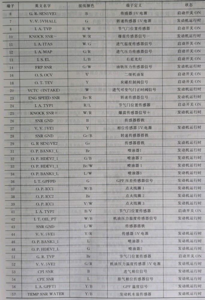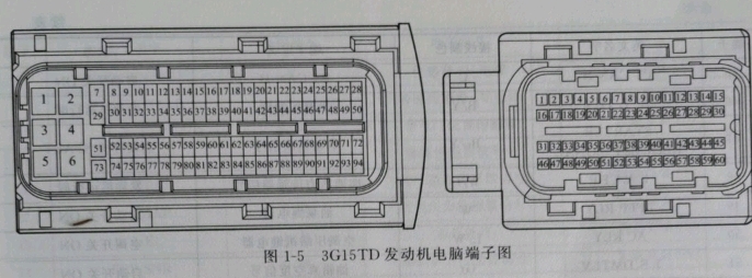 以吉利2018年款博瑞车型为例,3G15TD发动机电脑端子图如图1-5所示,端子定义见表1-7、表1-8