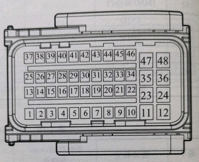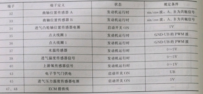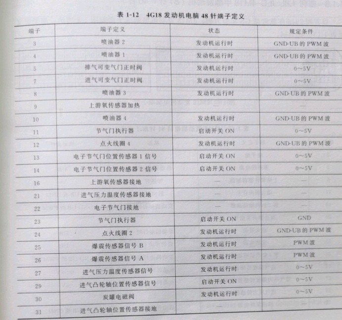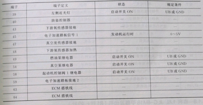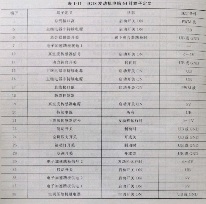 以吉利2016年款帝豪GS、2017年款帝豪GL车型为例,4G18发动机电脑端子图如图1-7所示,端子定义见表1-11、表1-12