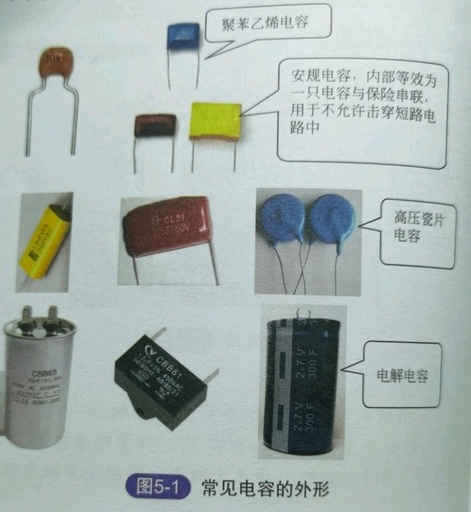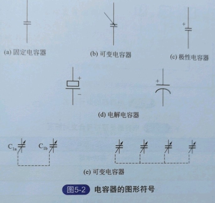 (1)电容器的作用、图形符号电容器简称电容,是电子电路中必不可少的基本元器件之一。它是由两个相互靠近的导体极板中间夹一层绝缘介质构成的。电容器是一种储存电能的元件,在电子电路中起到耦合、滤波、隔直流和调谐等作用。电容器在电路中用字母“C”表示电容器的外形和符号如图5-1和图5-2所示。