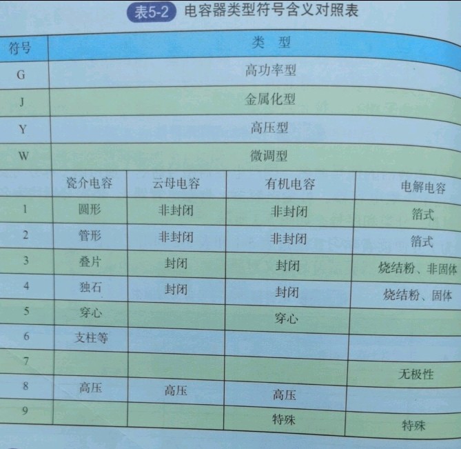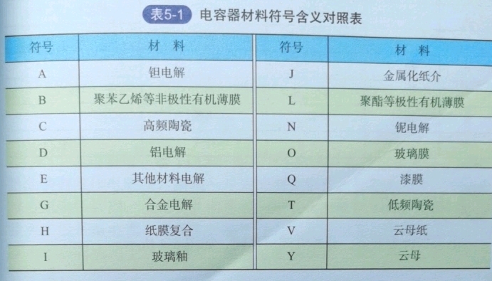 为了方便读者学习,通过表5-1和表5-2列出了电容器材料符号含义对照表和电容器类型符号含义对照表。