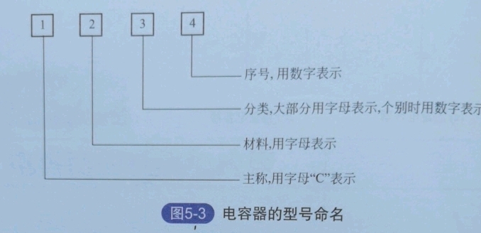 (2)电容器的型号命名国产电容器型号命名一般由四个部分构成(不适用于压敏电容器、可变电容器、真空电容器),依次分别代表名、,,称、材料、分类和序号,如图5-3所示。